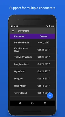 BattleTrack Initiative Tracker vereinfacht die Verwaltung von Kämpfen und Begegnungen in D&D und anderen D20-Rollenspielen. Erstellen, verwalten und verfolgen Sie mehrere Begegnungen mühelos. Fügen Sie Spieler und Monster schnell hinzu, um mehr Zeit für das Spiel zu haben. BattleTrack macht die Initiativverfolgung zum Kinderspiel.